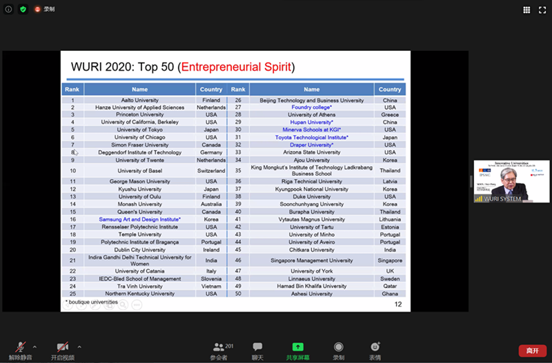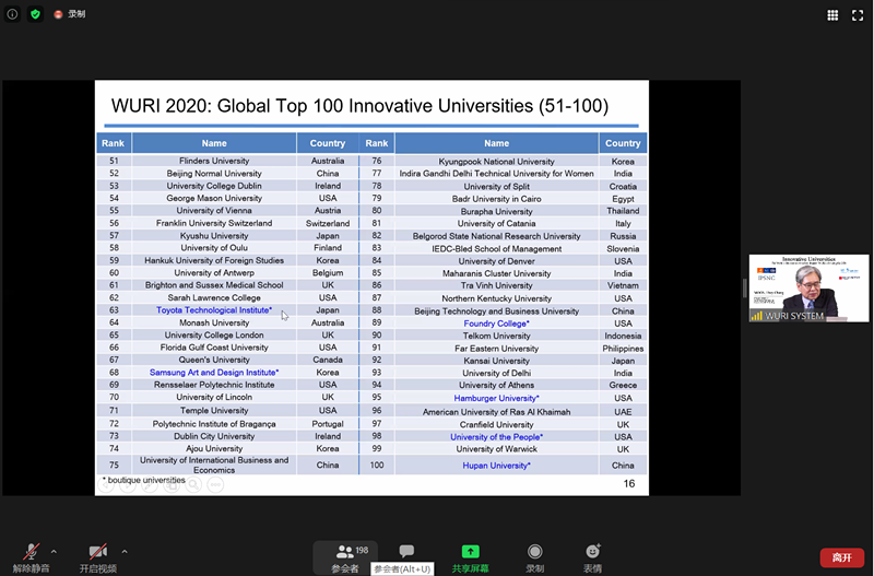 6月11日北京时间晚9点,2020年世界最具影响力前100高校排名(The World's Universities with Real Impact (WURI) Ranking for 2020)发布会采取Zoom在线会议的方式成功举行,主会场在韩国首尔。会议由4个全球机构组织发起:汉萨大学联盟(HLU)、瑞士日内瓦联合国训练研究所(训研所)、瑞士卢加诺富兰克林大学泰勒研究所(TI-FUS)和韩国首尔国家竞争力政策和战略研究所(IPSNC)。会议由三个部分组成,第一部分,世界最具影响力的大学排名项目组介绍排名机制,由世界最具影响力的大学排名项目负责人MOON Hwy-Chang教授发布2020年世界最具影响力的大学排名名单。第二部分,世界最具影响力的大学排名的工作人员和评委将对他们评审的创新项目给出总体评价。第三部分,部分申请高校通过简短的视频片段展示其的创新项目。学院申请小组成员以及学校国际交流处马雪娇副处长参加了会议。