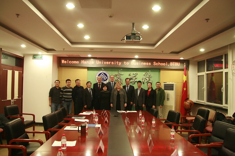 各系主任商谈两校关于“中国—欧洲”市场开发及电子商务方面的研究合作事项,会计系主任何玉润表示针对对方现有的“欧洲——中国研究中心”的相关项目,能否构建与财务会计相关内容的研究项目,深化合作,迪德瑞克•贝克院长表示很愿意能够与我校在该领域构建新的合作项目,并以此为契机加强双方的研究合作,创造新的研究成果。市场营销系主任张运来提出,针对中国中小企业进入欧洲市场的壁垒和困境,希望双方能建立研究合作平台,为欧洲、中国同类企业开拓对方市场提供支持和引导;工商管理系蒯鹏州表示,对于对方定期于每年上旬召开的关于商业经济论坛的计划很感兴趣,希望能有机会参与明年的活动,并希望能够对于会议的主题预先有所了解,以便做一些相关研究内容的准备。最后MBA教育中心范征向对方表达了双方针对国际留学生外教课程教授的工作意向交换了意见并就提高两校交换生数量达成共识。最后,双方代表在会议室合影留念。