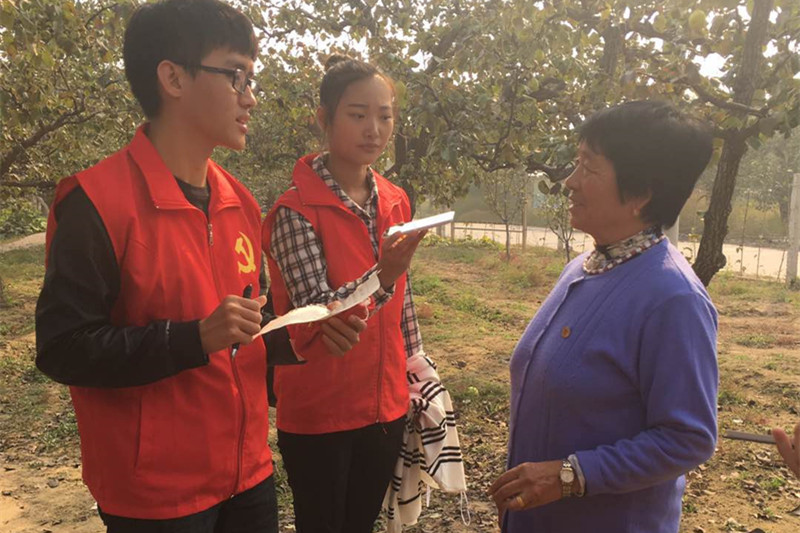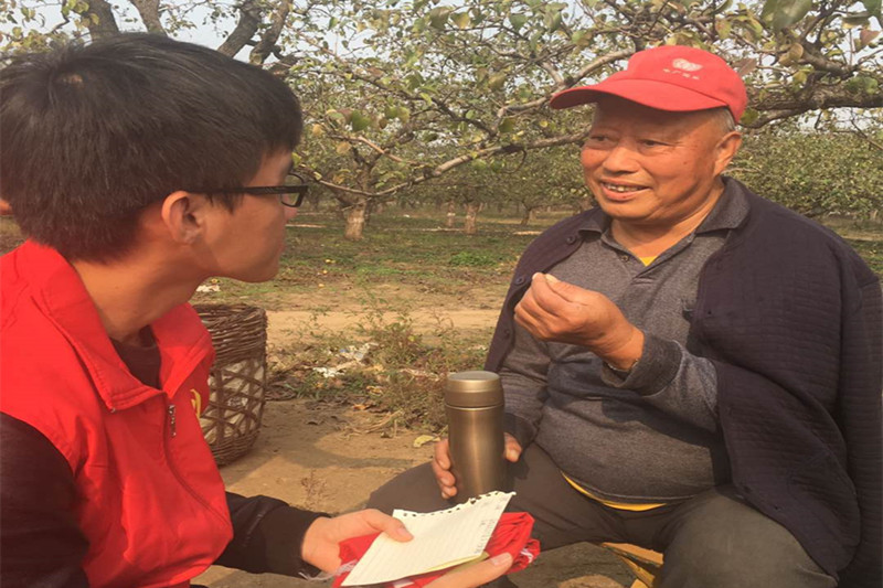 学生党员们分成三队对贾河村党支部成员和村民开始深入走访,同时开展志愿服务活动。在走访过程中,学生党员深入农村领导班子、农户家中和果园,详细了解了京白梨的年产量、深加工情况、旅游设施建设情况、景区接待情况等,在顺利完成调研内容的同时,也体会到了亲自采摘与大自然亲近的乐趣。
