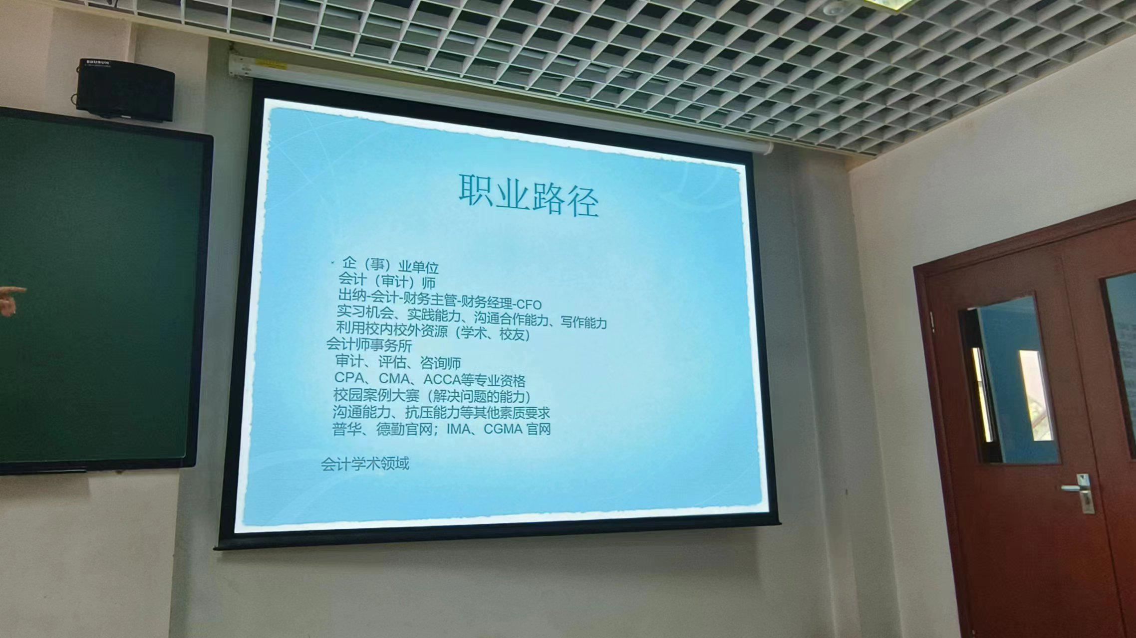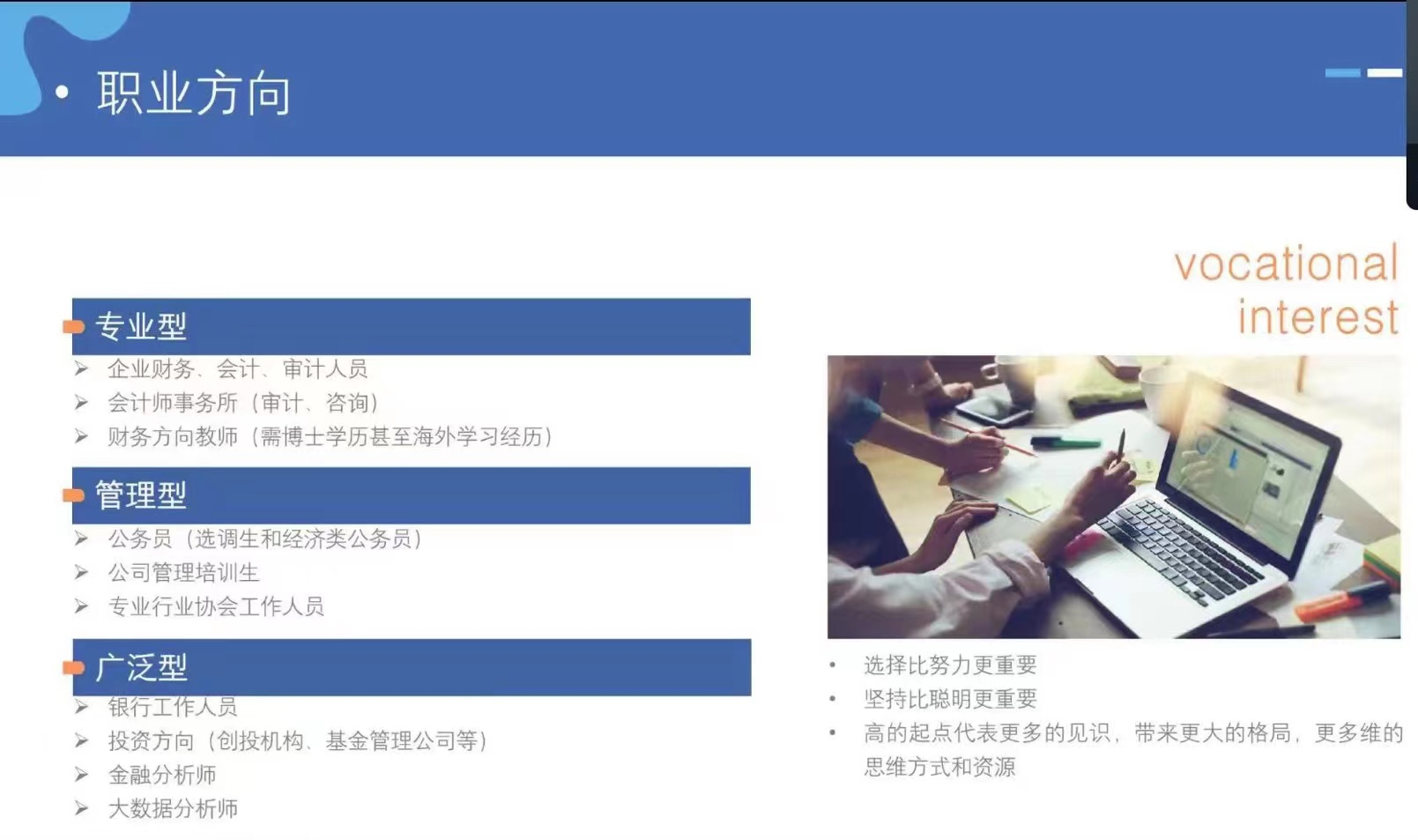 财务系高晨老师详细介绍了财会专业的职业发展方向,帮助学生们更全面地了解行业领域。她分别介绍了在企(事)业单位、会计师事务所和会计学术领域所能选择的方向。首先是在企(事)业单位方面,可以选择成为会计(审计)师,这一职业的常见发展路径是:出纳-会计-财务主管-财务经理-CFO。为了在职业发展中获得更好的机会,高晨老师建议同学们抓住实习机会,提高实践能力,加强沟通、合作和写作能力,同时,应珍惜校内外的资源。其次是会计师事务所,可通过获得CPA、CMA、ACCA等专业资格进入该领域,从事审计、评估、咨询等工作。此外,会计和财务专业毕业生还有其他就业选择,如创业、教育、咨询等领域,或进修更高级的学位,如硕士或博士学位,以提升个人职业发展。