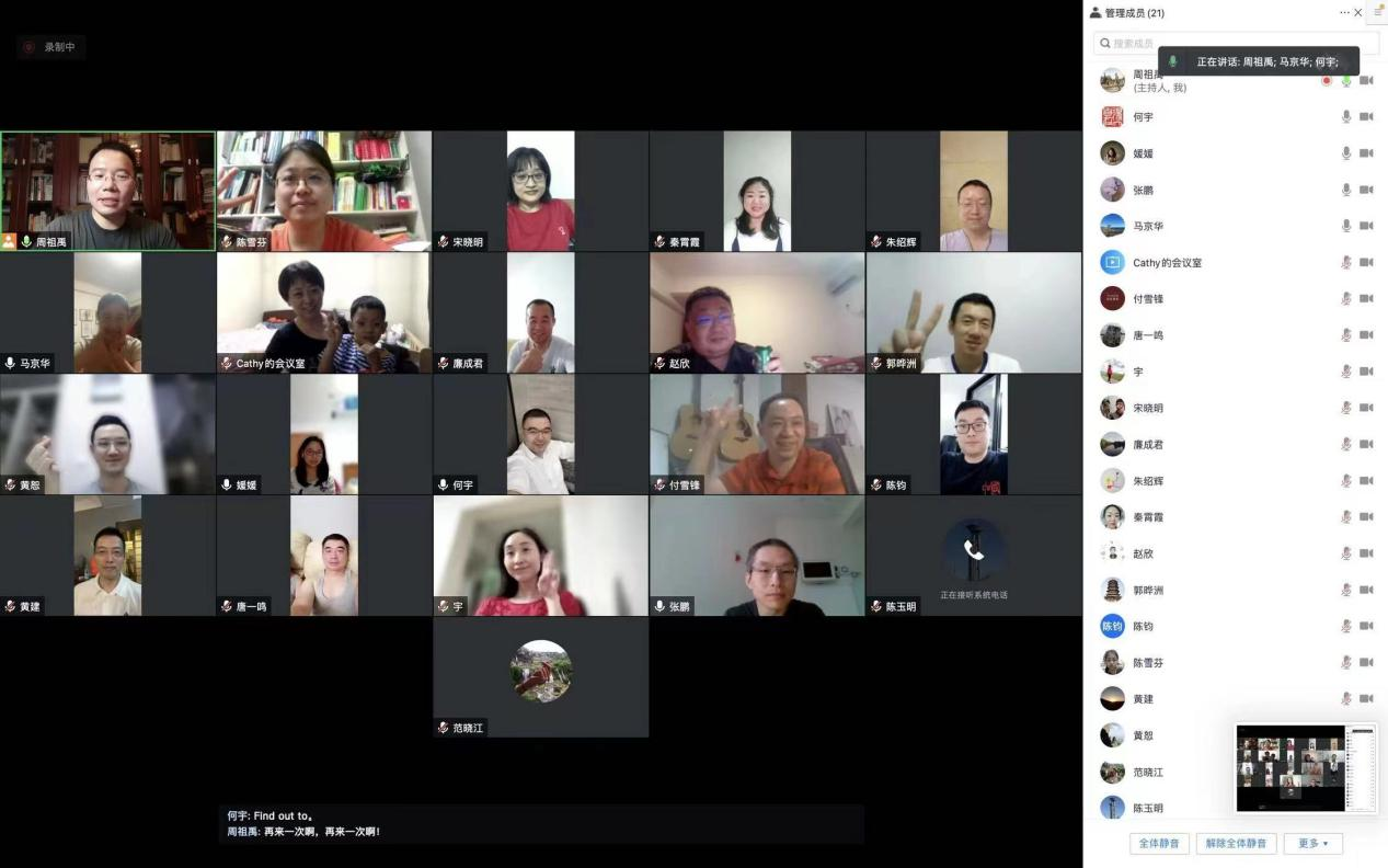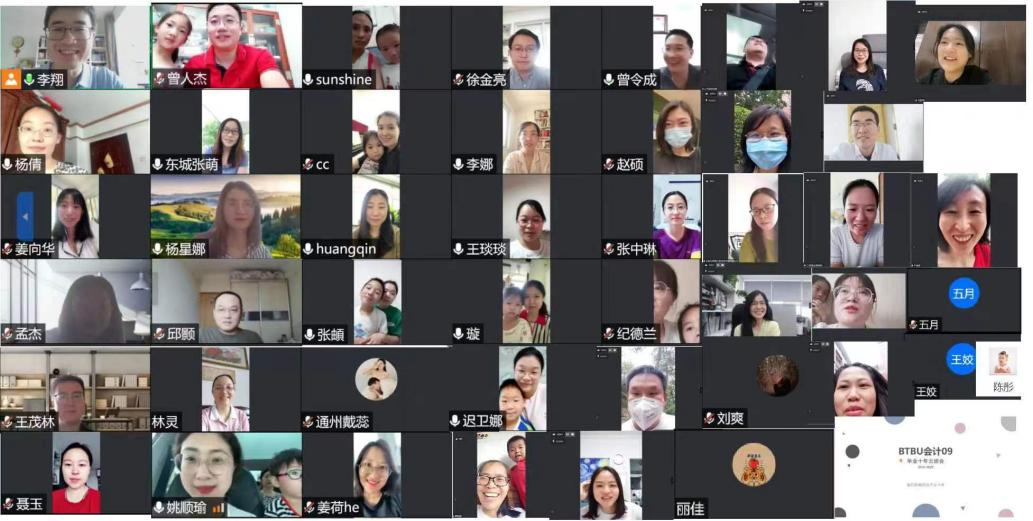 09会计研以“共忆青春、云聚母校,毕业十年再聚首,赓续师生同学情”为主题开启线上交流活动。同学们很重视此次久别重逢的聚会,大家十分积极地安排、腾挪出了十分宝贵的时间线上相聚。通过播放PPT,大家共同回忆校园美好生活。通过观看母校宣传片,唱响母校校歌,同学们深切感受母校十年的发展变化。在自由交流中,同学们分享了毕业十年后各自的人生,表达了同学之间的思念之情。最后,大家一起拍摄毕业十周年云合影留念。