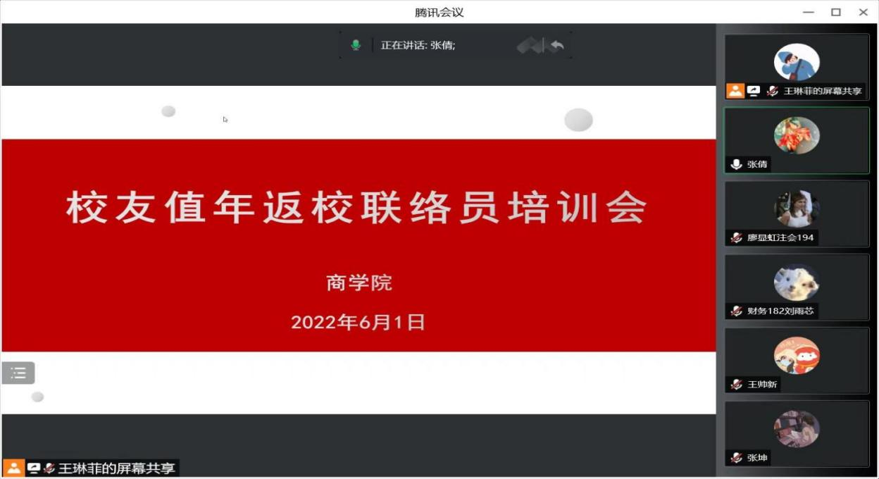6月1日,党委副书记张倩召开校友值年返校联络员培训会,邀请2021年校友值年活动两名志愿者负责人进行讲解分享。