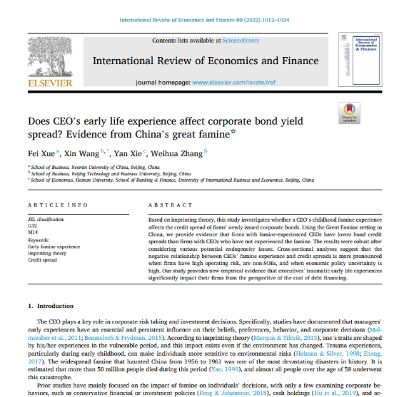 王欣博士在期刊《International Review of Economics and Finance》发表学术论文《Does CEO's early life experience affect corporate bond yield spread? Evidence from China's great famine》。该文章主要研究早期具有贫困经历的公司高管是否会影响公司债券信用利差,研究发现具有贫困经历的高管所在的公司的债券信用利差会相对较低,特别是当经济政策不确定性较高时,这个现象会更加明显。论文扩展了企业高管特质的经济后果以及企业债券信用利差的影响因素等方面的研究内容,并提出了经济政策不确定这一对两者间影响作用的边界条件。
