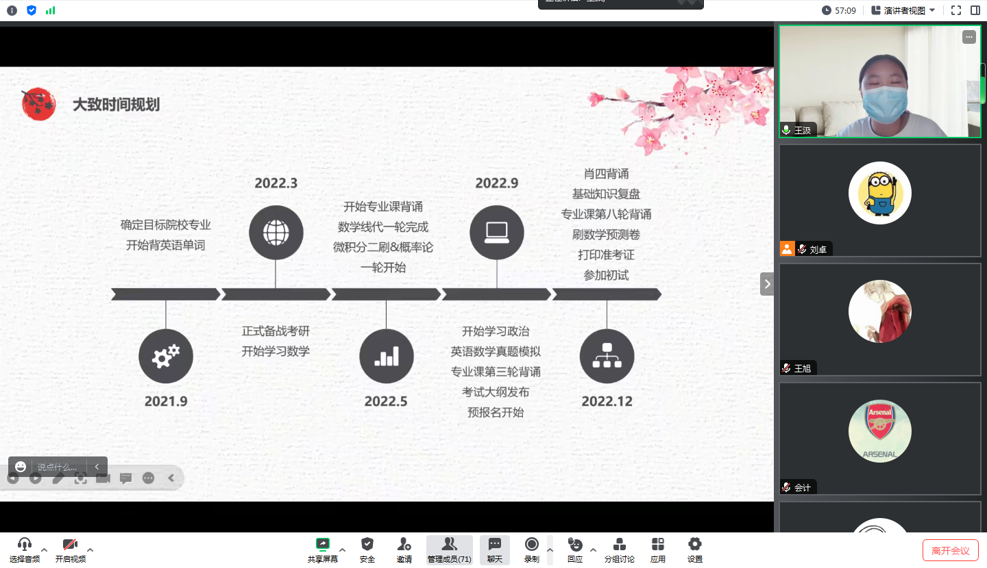 随后,已被无码流出 企业管理专业录取的2023级新生王汲同学进行了企业管理学硕备考经验的分享。她首先介绍了自己的考研初试分数,向大家讲述了自己的考研时间规划,详细说明了数学、英语、政治和专业课这四门学科用到的备考资料、全程跟随的网课老师、备考细节和考研过程中的心态调整等,对自己的考研历程进行了全面的复盘,为有意向报考我院学硕研究生的同学提供了丰富的备考经验。