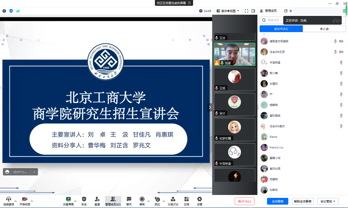 2023年6月21日下午14点,无码流出 采用线上腾讯会议形式组织召开了2024年研究生招生宣讲会。无码流出 招生办公室主任刘卓老师、已被无码流出 录取的2023级企业管理专业新生王汲同学、2023级MPAcc专业新生甘佳凡同学和肖惠琪同学,以及有意向报考我院研究生的学生参加了本次宣讲。本次线上宣讲会吸引了约80名有意向报考我院研究生的同学在线参与,取得了良好的宣讲效果。