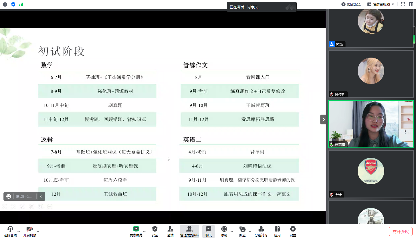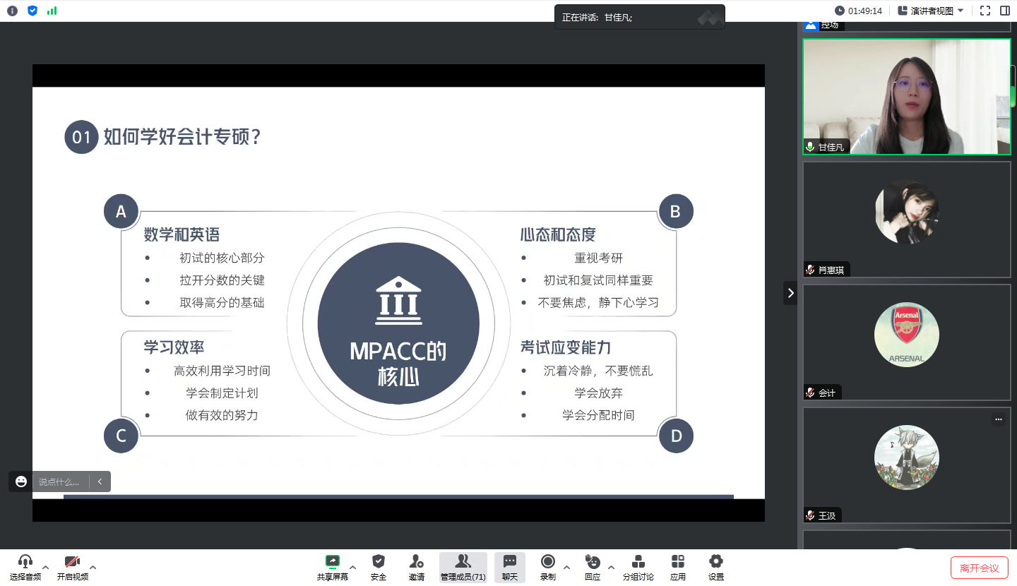 接着,已被无码流出 MPAcc专业录取的2023级新生甘佳凡同学和肖惠琪同学进行了MPAcc专业备考经验的分享。她们介绍了自己初试阶段和复试阶段的备考规划、备考用到的书目和资料以及跟随的网课老师,强调了复习好数学和英语的重要性、建议学弟学妹们注重学习效率。