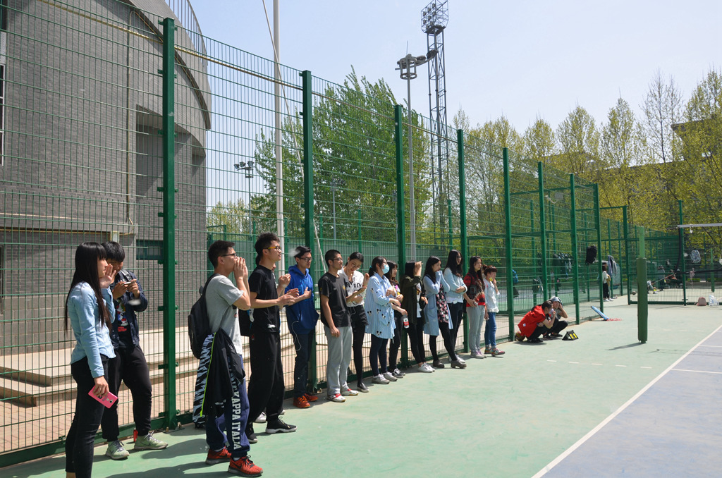 除了场上队员们出色的表现之外,场外由商院体育部组织的啦啦队也随着场上队员的精彩接球而欢呼,为商院女排呐喊,“商院加油”的口号响彻球场。
