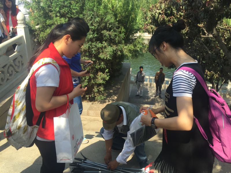 上午九点,阳光灿烂、清风送爽,志愿者部的干事们与志愿者们一起,集结在昆玉河畔。北京市水务局的两位工作人员热情地接待了我们,并将垃圾袋、夹子等工具一一分发给我们。