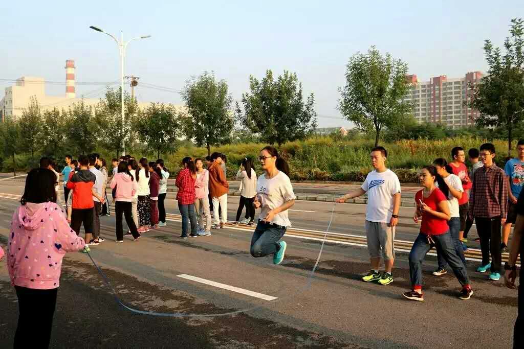晨跑过程中,16级新生们气宇轩昂,脚步声铿锵有力,“气贯长虹,笑傲苍穹,卧虎藏龙,商院最红”的口号声此起彼伏,无不彰显出商院学子奋发向上、勇往直前的精神面貌。此外,学院还组织进行了跳大绳活动,每位同学都积极地参与其中,在初升太阳的映射下,大家跳跃的身影蓬勃而又充满朝气。