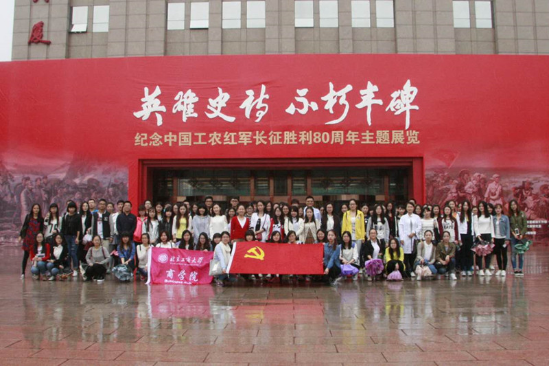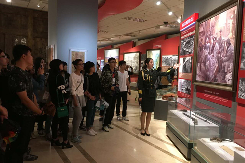 师生“重踏长征之路”的热情。来到军博后,同学们忙感叹军博那厚重的历史气息和人文积淀,一路上伴随着讲解员生动的解说,同学们与老师们都全神贯注的认真学习着长征英雄事迹和长征精神。面对深刻的文字、真实的照片、确凿的文物,八十几年前红军“爬雪山、过雪地、挖草根、吃树皮,四渡赤水、血战湘江、巧渡金沙江、强渡大渡河、翻越夹金山。。。”的一幕幕景象仿佛就在眼前重演。军事博物馆内一系列与长征有关的内容,都让同学们切身体会到了当年中华儿女“青山依旧在,不见儿郎归”的艰苦岁月,感受到中国共产党“红军不怕远征难,万水千山只等闲”的壮丽史诗,领悟到老一辈先烈“为有牺牲多壮志,敢叫日月换新天”的伟大精神。聆听历史回响,思考中国奇迹。