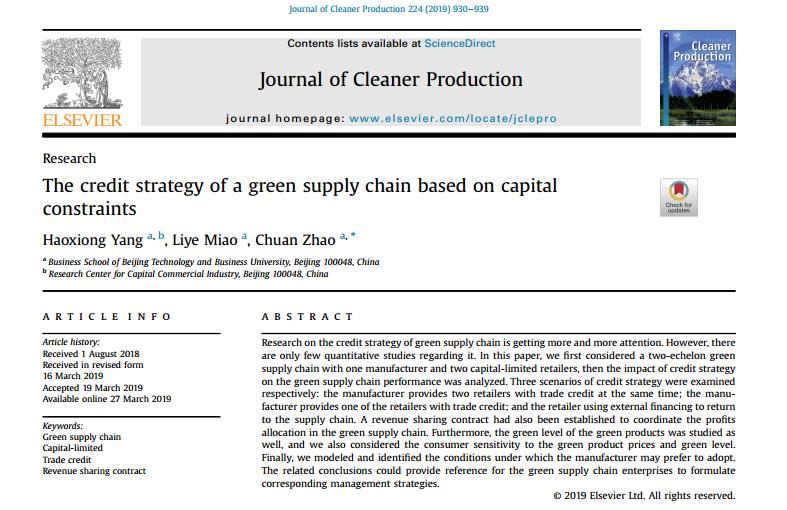 近日,我院副院长杨浩雄教授作为第一作者,在权威期刊《Journal of Cleaner Production》上发表学术论文《The credit strategy of a green supply chain based on capital constraints》,该期刊由Elsevier出版,SCI检索(JCR一区),中科院一区TOP期刊,影响因子为5.651,5年期影响因子为6.352。该论文第二作者为我院管理科学与工程研究生苗丽叶,第三作者为我院物流系副教授赵川老师。