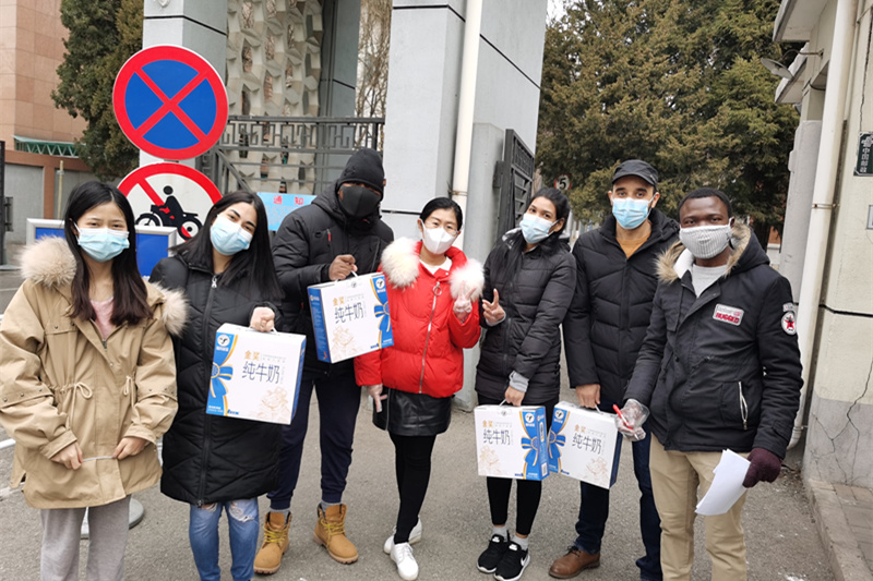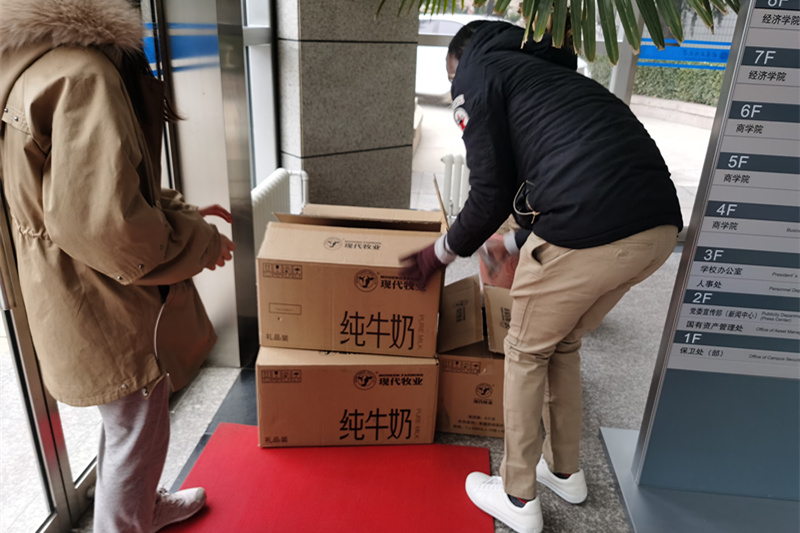 MBA学子工作后又重返校园,心怀感恩与责任,他们在MBA联合会的组织下为每位留校学子捐赠一箱牛奶以及饮料、瓜子、花生等零食。由于疫情防控需要,他们不能返校,由MBA联合会指导老师孙硕代为捐赠。为防止学生聚集扎堆,采取室外发放,错开通知、分散领取的方式。西区留校同学在综合楼外分批领取,东区留校同学在东区南门外分批领取。发放老师佩戴一次性口罩和手套,所有领取同学佩戴口罩并配合保卫处抽查体温。来自利比里亚的留学生JACKSON主动帮老师搬箱子拉小推车,头上冒汗却表示自己“not tired”。来自新疆的维吾尔族同学帕孜来提表示:自己已经大四了,正在网上实习,有了学院的补给,更有动力了。等在东区的留学生远远看到老师拉着牛奶的小推车过来,一起用英文喊:“Thank you,China!”大家和保安大哥们一起开心的笑,仿佛可以驱散所有的阴霾。