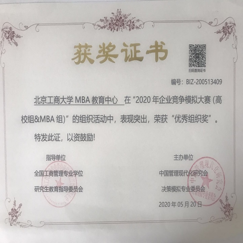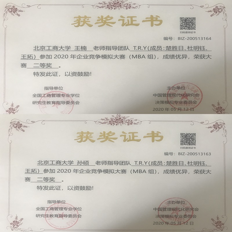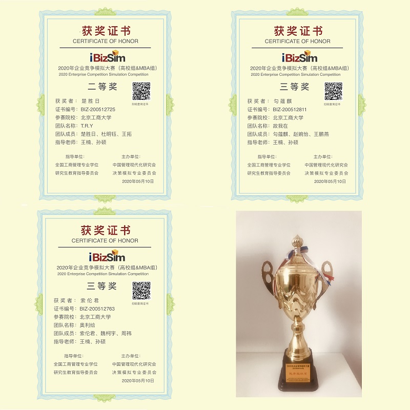 2020年企业竞争模拟大赛(高校组&MBA组)于3月份正式启动。经过初赛、复赛、半决赛、总决赛四轮比赛,于2020年5月10日圆满结束。此次参赛是我院MBA教育中心首次自行组织参赛,在我院参赛的七支MBA队伍中,共计荣获一个二等奖,两个三等奖,指导教师王楠、孙硕老师荣获优秀指导奖,无码流出 MBA教育中心荣获优秀组织奖。