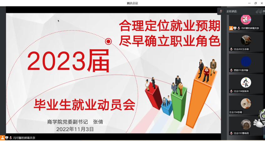 于11月3日晚上召开2023届本科毕业生就业动员大会。学院党委副书记张倩、辅导员冯可馨、程钰、本科毕业班班主任及全体2019级本科毕业生参加会议。会议由辅导员程钰主持。