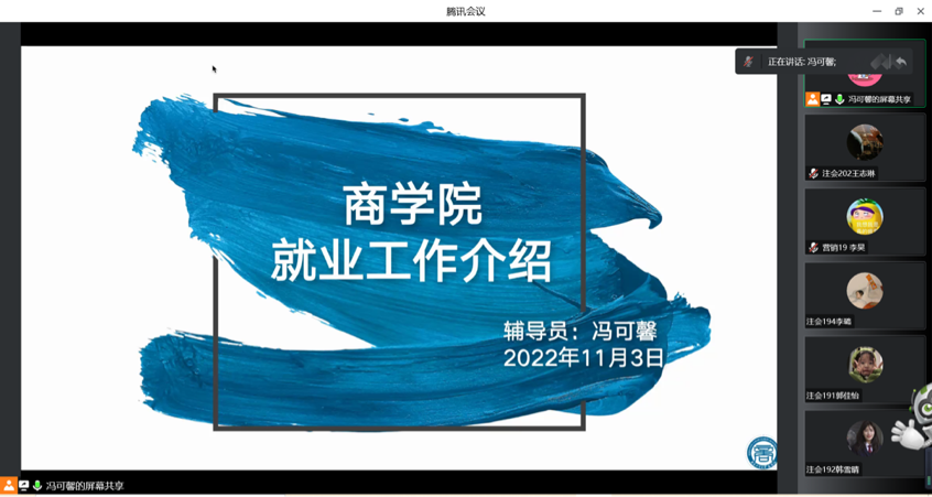 随后,毕业班辅导员冯可馨老师系统介绍了就业手续办理等政策和相关注意事项,着重对毕业生就业流程中的重要文件进行了详细的介绍和讲解,包括毕业生去向、就业推荐表、三方协议、户口迁移证、报到证、政审流程等。最后,冯老师为同学们分享了诸多优质就业服务机构网站以及相关就业信息公众号,希望同学们多多搜集资料信息,把握机遇,高质量就业。