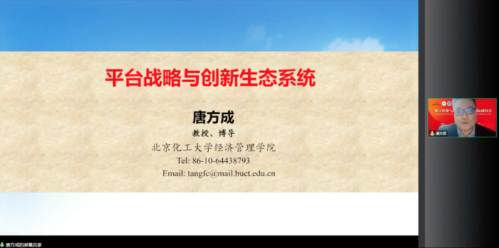 中国科学院科技战略咨询研究院研究员、国家杰出青年基金获得者陈凯华主持,北京师范大学经济与工商管理学院教授、国家优秀青年科学基金获得者焦豪教授和北京化工大学经济管理学院院长、全国高校人工智能与大数据创新联盟“新商科专委会”副主任唐方成教授做主题报告。焦豪教授做了“数字平台生态观:数字经济下企业战略管理新范式”的报告,表示数字平台生态观将成为数字经济时代企业持续竞争优势的新来源。唐方成教授以“平台战略与创新生态系统”为题,提出,平台战略是资源的聚合,创新生态系统需要融合、协同多方面共同发展。