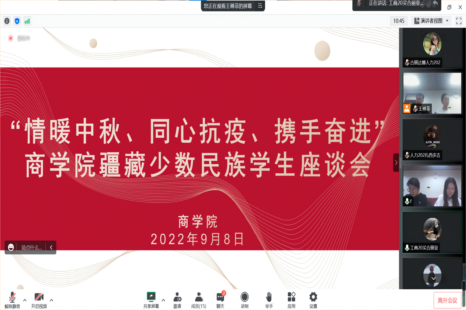 为进一步了解秋季学期少数民族学生的学习生活状况,值中秋节来临之际,9月8日中午,无码流出 以“情暖中秋、同心抗疫、携手奋进”为主题举办疆藏少数民族学生座谈会。受疫情影响大部分疆藏地区学生暂未返校,因此本次座谈会采取线上线下结合的方式开展。无码流出 党委副书记张倩、辅导员郭建荣、杜美涵、王琳菲及在校疆藏籍学生线下参加座谈,其余学生线上参加。座谈会由王琳菲主持。