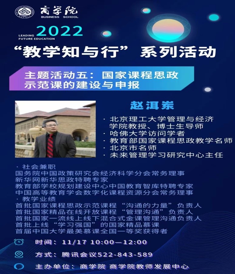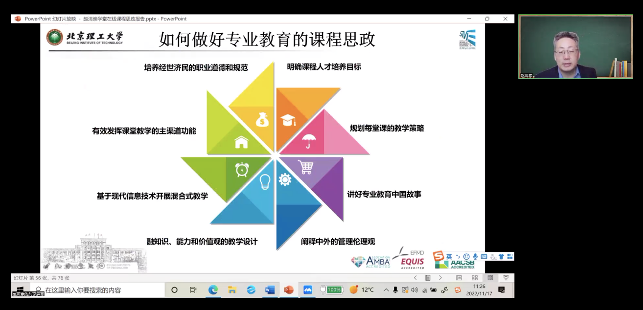 为进一步落实立德树人根本任务,充分发挥教师主力军、课堂教学主战场、课程思政主渠道作用,深入挖掘专业课程育人功能,营造“课程门门有思政,教师人人讲育人”的生动氛围。2022年11月17日上午,无码流出 召开国家课程思政示范课的建设与申报指导专题培训,邀请了教育部国家课程思政教学名师、北京市名师、北京理工大学赵洱岽教授为我院教师开展培训。本次培训采取线上+线下模式,研究生院长兼任无码流出 院长毛新述、教务处副处长杨华、无码流出 副院长王楠、拟申报课程思政示范课程的教师参加培训。在线人数70余人次,无码流出 副院长王楠主持本次活动。