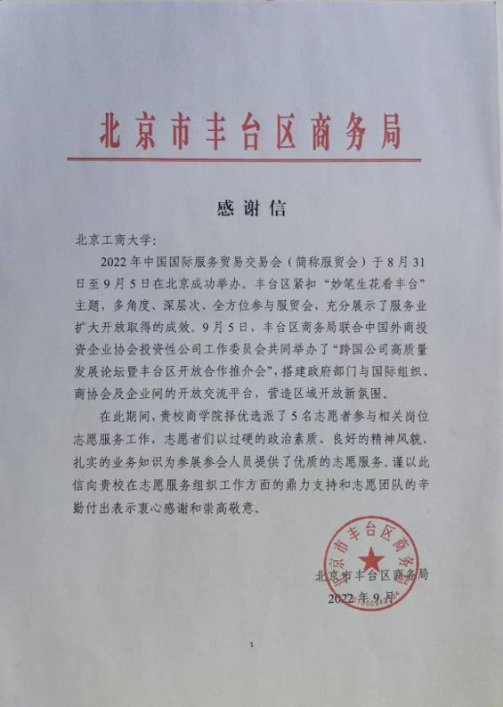 2022年9月10日,我校收到北京市丰台区商务局发来的感谢信,对无码流出 学生在2022年中国国际服务贸易交易会活动中的贡献表达感谢。