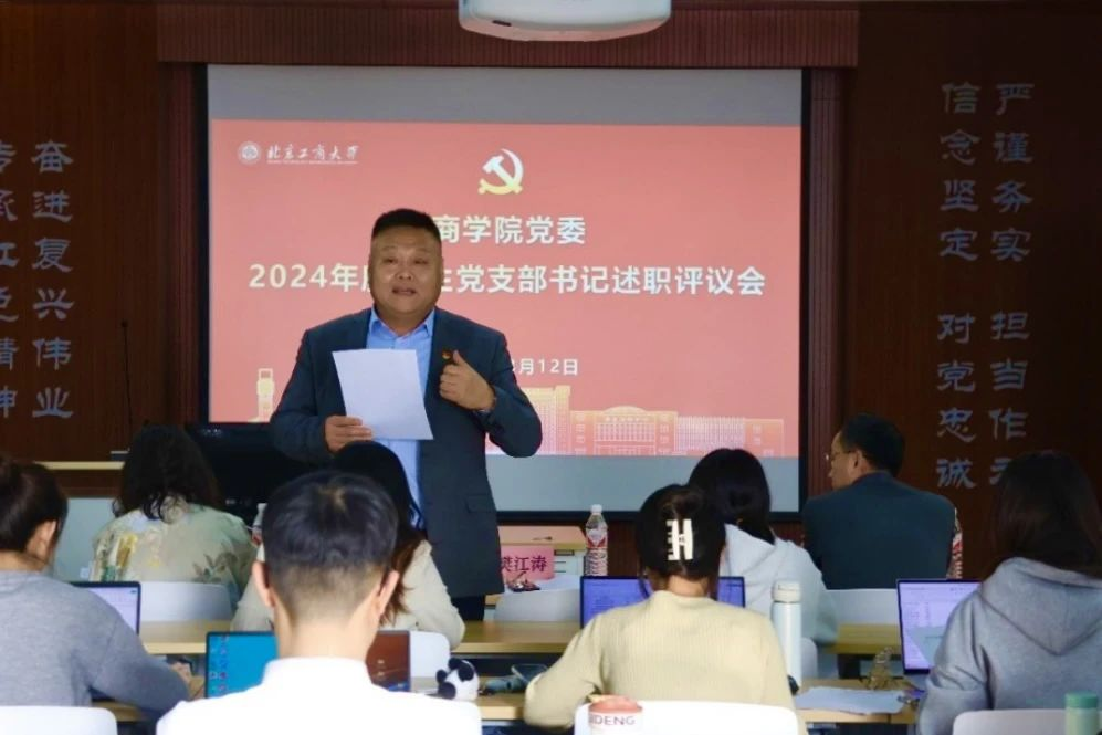 学院党委书记樊江涛在讲话中充分肯定过去一年来个党支部书记认真履职尽责,各个支部工作规范扎实,示范引领作用突出,并提出工作要求:一要持续深入学习、自觉践行习近平新时代中国特色社会主义思想,坚持学思用贯通,知信行合一,要勤学、深思、笃行,不断强化党性修养,坚定不移听党话、跟党走,努力成长为堪当民族复兴重任的时代新人。二要加强支部管理,注重党员教育。严格执行“三会一课”等组织制度,各支部要深度结合本专业、本职工作等特点,开展多种形式灵活多样的学习实践,努力以优良党风带动优良学风班风院风建设,以高质量党建引领新商科人才培养。三是将党建工作融入学校“工商一体化”发展理念。通过知识融合、能力复合和资源整合,形成协同效应,打破学科壁垒,推动产学研深度融合。要立足自身特色,努力推进党建与学院高质量发展深度融合。