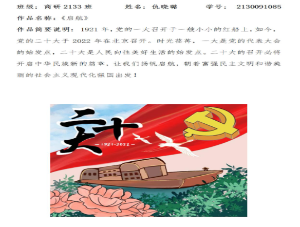 活动中,同学们群英荟萃,一展才华。毛笔挥墨成川,篇幅行云流水,同学们在传承中华传统文化中陶冶情操。《奋进新征程 书写新篇章》、《征程万里风正劲 重任千钧再出发》,毛笔字的墨水染浓了新时代新征程;《启航》、《党星》,一幅幅图画绘色党史,立精神支柱,建精神家园,艺术之美甚是高雅;快门定格永远,相机记录世间美好,《胡同》、《灯会》等摄影作品构图完整干净、角度独特、用光巧妙;《桃花朵朵开》随着欢快的音乐翩翩起舞,带来轻松愉悦的心态;更有娓娓动听的《我和我的祖国》、《蝴蝶泉边》独唱,宛转悠扬的《万疆》、《如愿》、《Twilight》独奏,展现了积极向上的青春风采和精神面貌。满溢而出的创作才华令读者们沉浸不已。