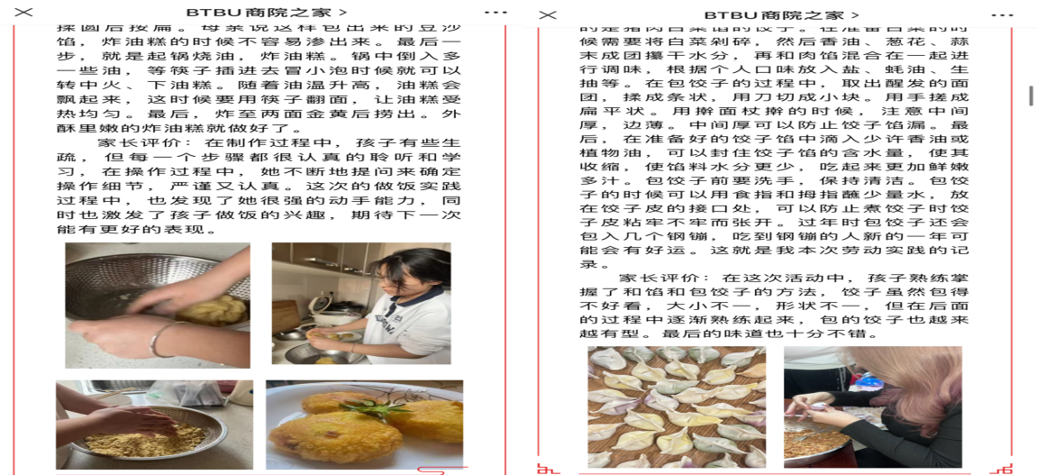 为了激发学生热爱劳动的内生动力,引导学生学会劳动、乐于劳动,掌握必备的劳动技能,形成尊重劳动,劳动光荣的新风向,学院在1月13日至2月15日开展“喜庆二十大,劳动不断线”寒假劳动教育实践活动,主题为“在劳动中成长淬炼”。同学们自己动手做的家乡菜让人垂涎欲滴;大扫除后的房间一尘不染;垃圾分类井井有条;家庭防疫一丝不苟;传统文化相关的作品也精美绝伦,受到了同学们的一致好评。截止活动报名结束,共有近40余人参与本次活动,劳动内容丰富多彩,如“学做一道就家乡菜”中同学们各显奇招,制作各自家乡的传统美食炸油糕、包饺子、糖醋里脊、皮蛋豆腐等等美食佳肴。同学们上传了自己认真劳动的照片,同时也感悟到劳动使人幸福。的确,当一个人专注于自己的劳动时,思维是敏锐的,心灵是充实的,精神是愉悦的,可以说,作为一名劳动者,就是一个幸福的人!