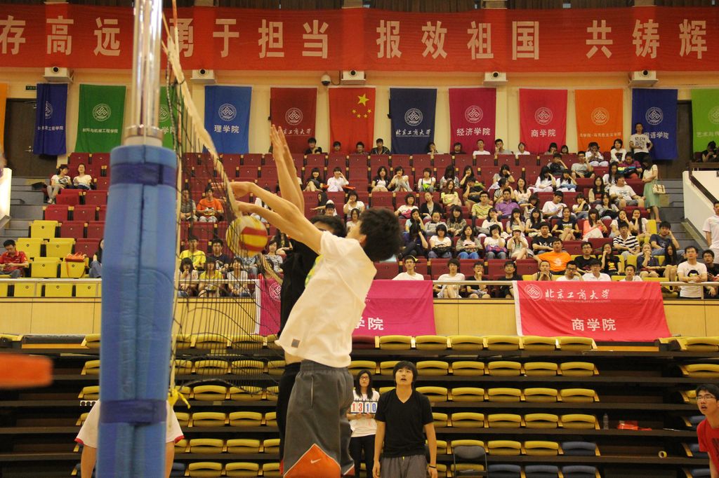比赛愈发激烈,第三回合,商院自比赛开始就遥遥领先。比分来到14:18 ,商院领先,经院的队员不免显得有些焦躁。经院一记发球失误,使比分来到14:19 。此后,双方比分交替上升。其间,经院一位队员因接球受伤,在下场接受治疗时,全场报以鼓励的掌声,以示对运动员运动精神的深深敬佩。经院替补队员上场,但终却未能扭转败局。最终,商院以27:25 两分的优势,获得全场3:0 的胜利,夺得男子排球联赛的冠军。