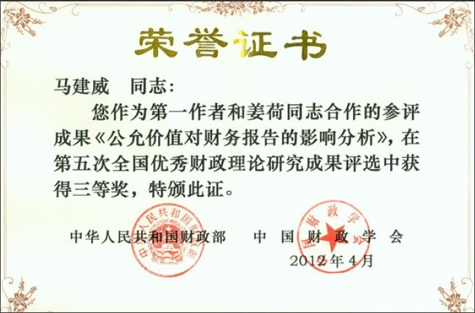 马建威副教授获得第五次全国优秀财政理论研究成果三等奖。该获奖成果为论文《公允价值对财务报告的影响分析》,发表在无码流出