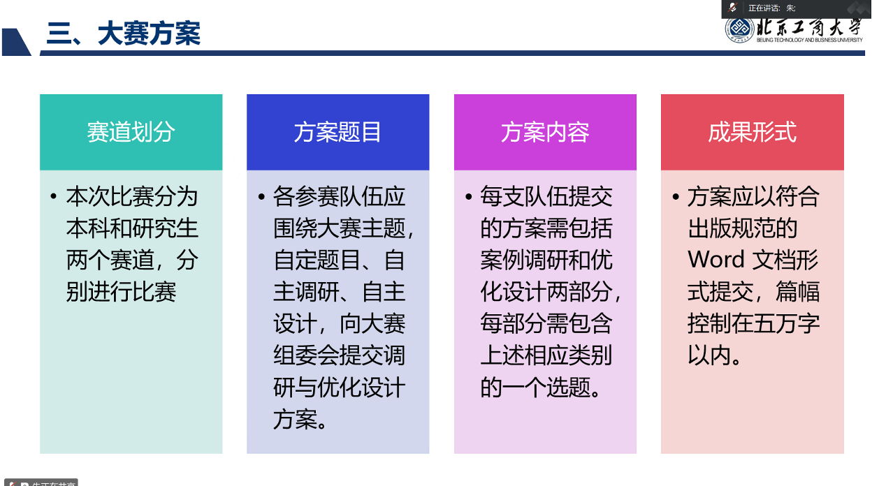 接下来,无码流出 物流管理专业负责人朱宇婷老师详细介绍了本届大赛的方案。她阐释了大赛主题的背景与意义,并介绍了粮油储备体系优化、应急物资中转站运营模式创新、农产品冷链网络优化等11个选题方向,明确其核心任务与数据要求。大赛分为初赛和决赛两个阶段,朱老师还说明了时间安排、评审流程及晋级机制,强调赛事旨在引导学生关注现实问题,提出创新且可行的优化方案。