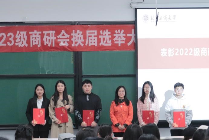 会议开始,2022级商研会主席陈楚涵对过去一年的工作进行了汇报,总结了工作的成果,指出了存在的不足,并对未来工作进行展望。随后,潘萌为22级优秀学生干部颁发证书。竞选环节中,各位候选人依次上台演讲,阐述拟竞选的岗位、对工作的设想、表达为学院师生服务的意愿等,参选同学相互鼓励、相互支持,用实力和热情展示自己。答辩结束后,大会采取现场投票的方式选出了商研会主席团成员及各部门部长和副部长。
