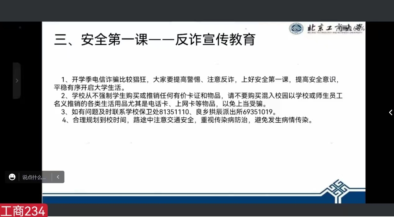 为上好安全教育第一课,做好防范电信网络诈骗宣传,各班班主任向2023级新生介绍了如何分辨电信诈骗电话等反诈骗手段和技巧,告知学校保卫处及属地报警电话,鼓励学生发现问题要及时求助,筑牢校园安全稳定防线。
