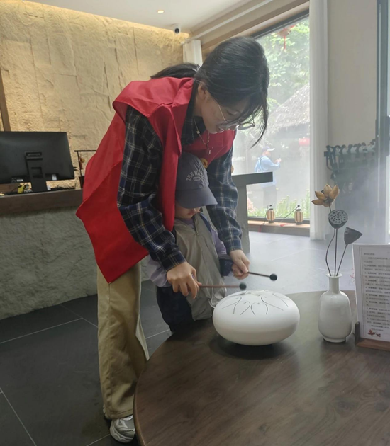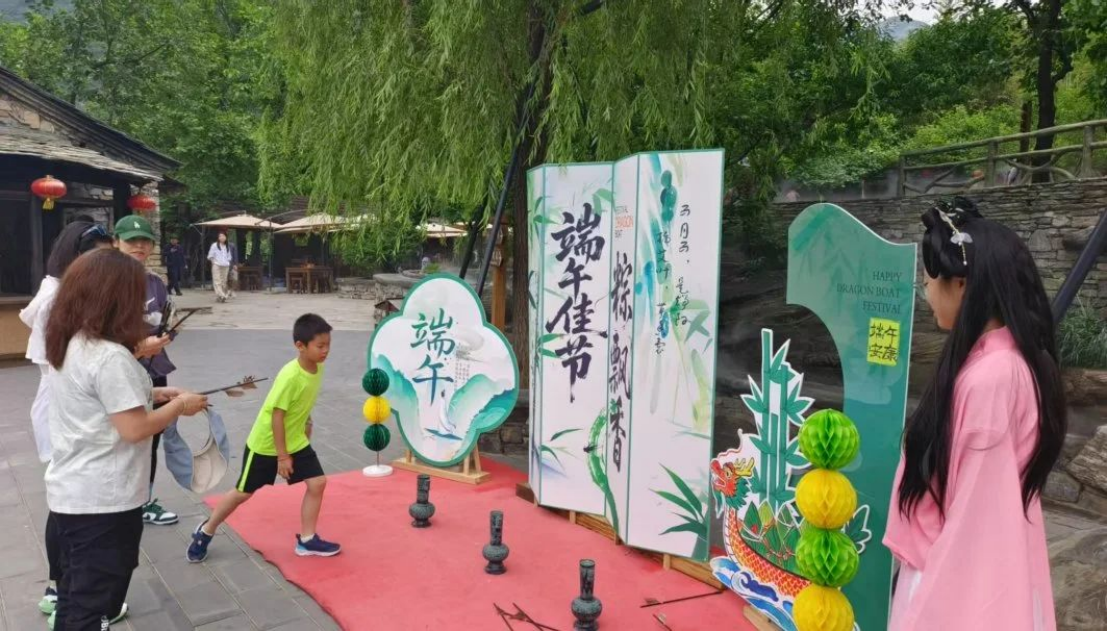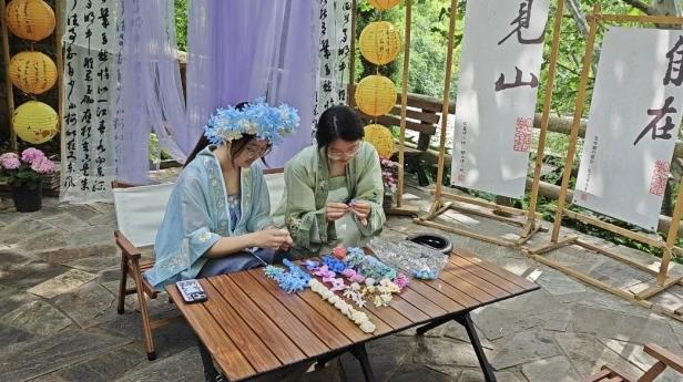 云上石屋大梨树平台,非遗魅力璀璨绽放。中草药香囊沁人心脾,学子们协助游客巧手缝制,艾香氤氲,驱邪纳福;指尖翻飞处,非遗簪花悄然绽放于发髻,千年美学触手可及;精巧的竹编小舟载着祈愿,顺溪漂流。不远处童话森林广场,钓粽子的银弧划破长空,童趣与非遗在此刻完美交融。
