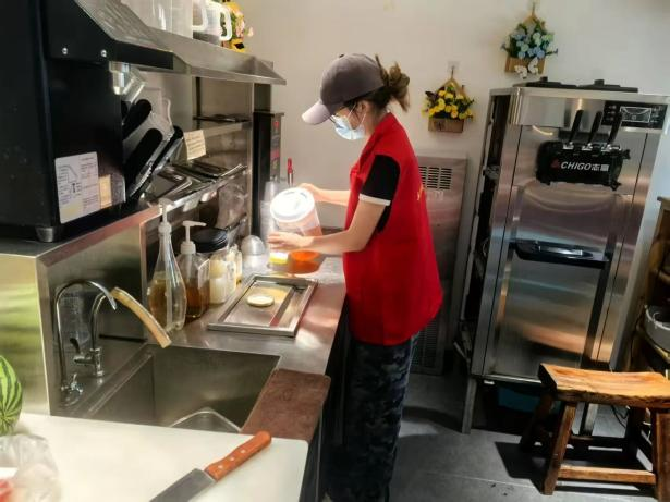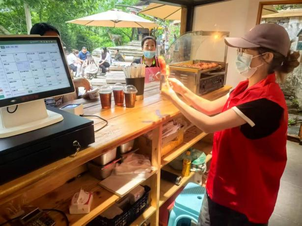 红色背篓餐饮部特色摊位前,商科智慧闪耀田间地头。学子们娴熟收银、热情推介,将山楂汁、豆腐等黄山店“山野风味”。
