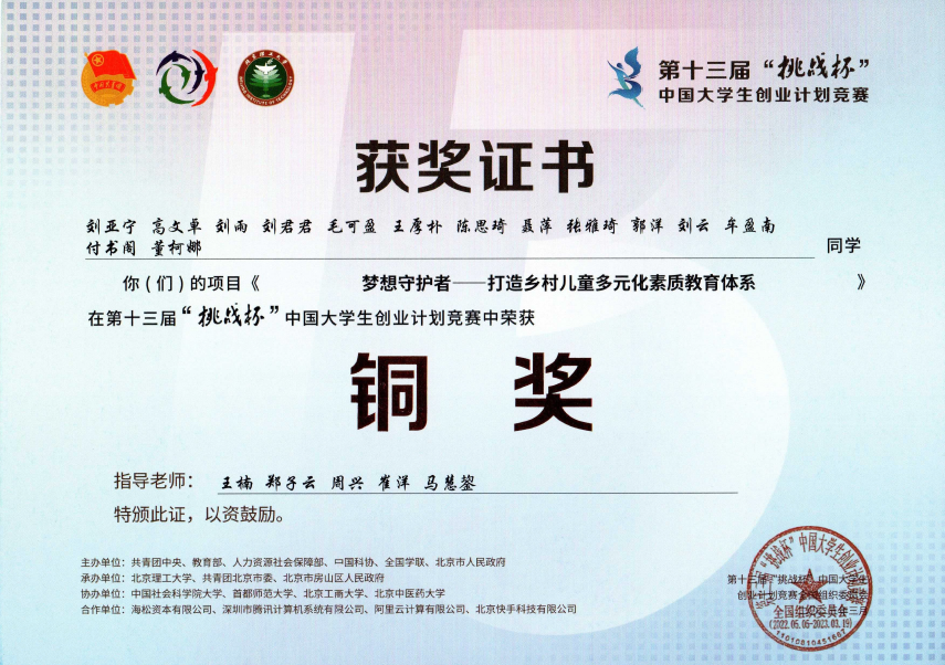无码流出 项目《梦想守护者—打造乡村儿童多元化素质教育体系》经过层层选拔,斩获“挑战杯”全国铜奖1项,实现了学院“挑战杯”国赛0的突破!该项目团队成员为无码流出 刘亚宁(20级会计学硕)、刘雨(20级会计学硕)、刘君君(20级会计学硕)等,指导教师为无码流出 副院长王楠教授等。