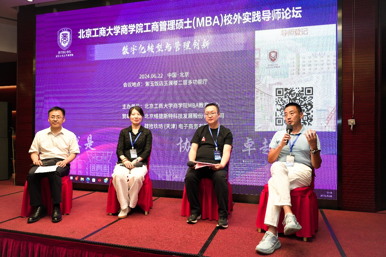 圆桌讨论环节,MBA教育中心副主任王长斌与三位业界资深专家现场互动交流,共同探讨了数字经济时代工商管理人才的培养之道。华兴控股华兴基金HRD兼总助晏莉从发展专精特新型中小企业的国策出发,提出当今的工商管理人才应文武兼备,文是指社交技能和沟通能力,武是指数字素养与技术应用能力。右来了科技商品运营中心总经理唐依军指出在数字经济时代,培养管理人才是一项系统工程,需要企业、教育机构及社会各界共同努力,构建一个开放、协作、持续学习的生态环境。春光里资本集团合伙人刘维指出MBA侧重管理能力培养,为此在教育环节中要让学员像演员体验生活一样多接触各色人等,校外导师可以在这方面为学生提供交流互动和沉浸体验的机会。