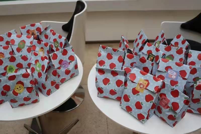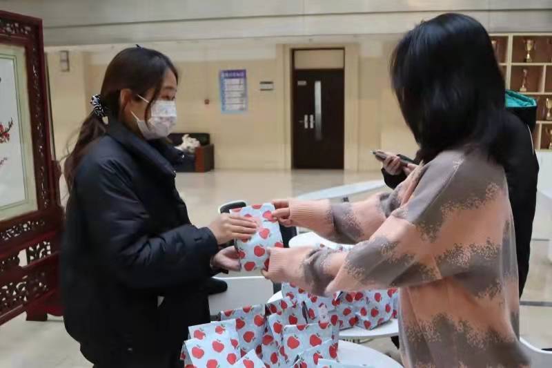 红彤彤的苹果,每一个都承载着同学们真切的祝愿。每个收到小礼袋的考研学子都会发自内心的露出微笑并轻声道谢,继而迈着更坚定的脚步离去。刘同学从开学初就投入到了复习考研的大军中,当他收到学院为他们绿色通道的学生专门准备了考研祝福礼物的通知时,他一大早就来到了商楼,他说这是自他决心考研后,第一次切切实实的感受到自己并不孤独,也不是在孤军奋战。正如他所言,这些追梦人身后是学院的老师同学作为最坚强的后盾。千言万语的祝福被放进小小的礼物袋里,陪着他们大步向前。