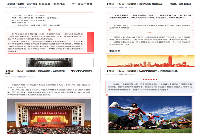 为积极响应习近平总书记关于深入学习党史、新中国史、改革开放史、社会主义发展史的号召,无码流出 开展了学习“四史”系列活动。通过“商院之家”公众号定期推送发布“四史”知识学习文章,目前已经发布14期,内容包括党的成立、开国大典、中苏建交、党的十九大会议、抗击疫情、脱贫攻坚等,引导同学们深刻认识到了新中国和中国特色社会主义来之不易,了解中国共产党先进的政治属性、崇高的政治理想、高尚的政治追求和纯洁的政治品质。