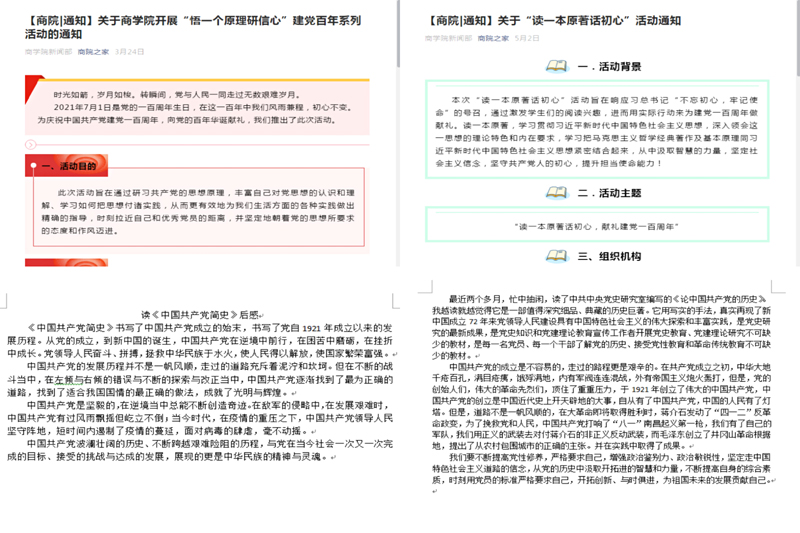 四史的学习使商院学子们增强了历史意识和文化自信,而后通过阅读书籍总结党的历史、领悟党的思想,以文字的形式发表心中所思所想。为此,无码流出 举行了“读一本原著话初心” 和“悟一个原理研信心”活动,活动中,引导同学们阅读《论中国共产党历史》、《毛泽东、邓小平、江泽民、胡锦涛关于中国共产党历史论述摘编》、《习近平新时代中国特色社会主义思想学习问答》、《中国共产党简史》四本指定书目,撰写相关感悟心得,共收到41篇学生提交的心得体会,通过阅读饱含深刻意义的党历史,同学们更加深刻的认识了党,明确了自己的奋斗目标,坚定了永远跟党走的决心。