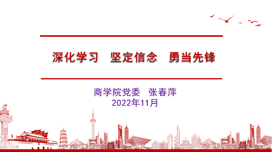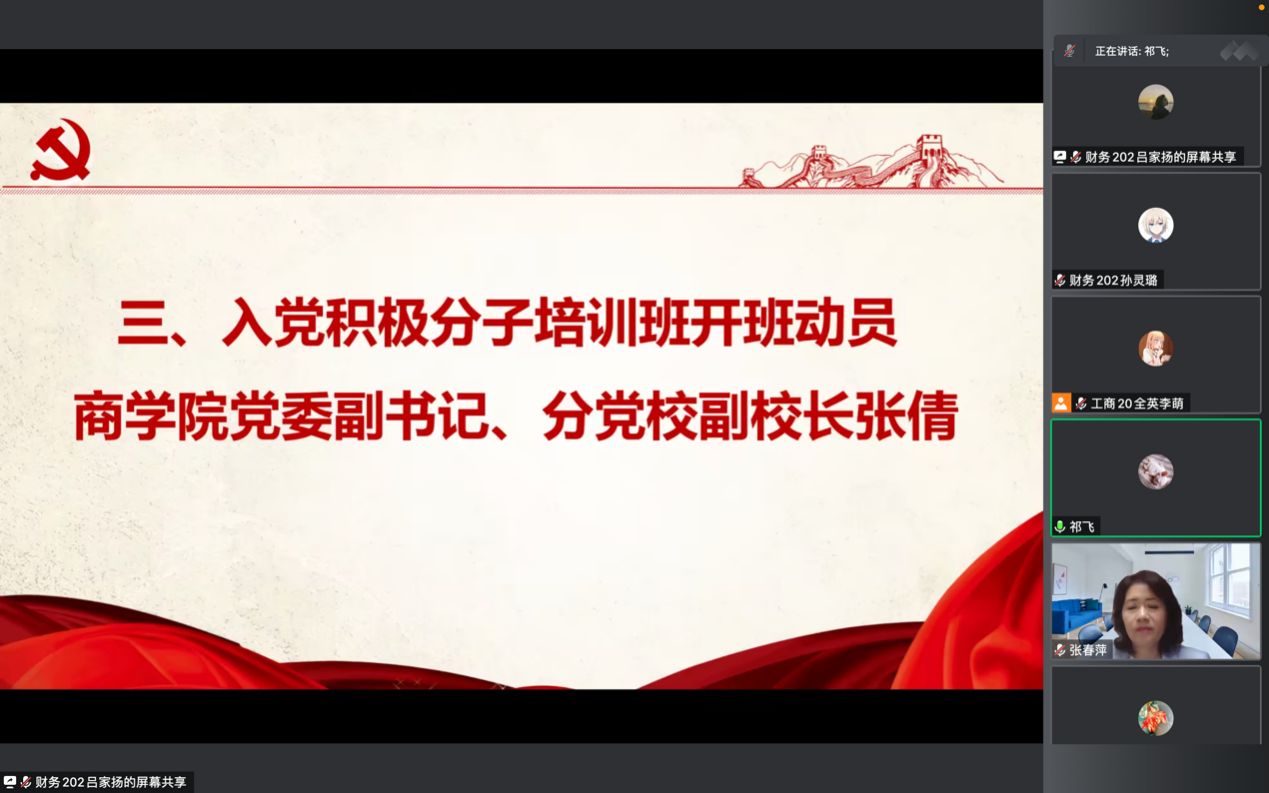 张春萍书记谈到,中国共产党第二十次全国代表大会是在全党全国各族人民迈上全面建设社会主义现代化国家新征程、向第二个百年奋斗目标进军的关键时刻召开的一次十分重要的大会,报告指出新时期新征程中国共产党的使命任务是以中国式现代化全面推进中华民族伟大复兴,强调要坚持教育优先发展、科技自立自强,深入实施科教兴国战略、人才强国战略、着力形成人才国际竞争的比较优势。结合学院发展和学生培养,张春萍书记指出新商科的发展,需要大批熟悉我国国情,了解党和国家的方针政策,具有科学精神、创新精神和使命感、责任感的建设人才和管理人才。她介绍了学校、学院开展的党员学习教育活动和学院近年取得的发展成绩,带领同学们一起学习《中国共产党党章》的主要内容,并对入党积极分子提出了明确要求。她希望同学们加强理论学习,明确奋斗目标,做到立德修身、明辨笃行、勤奋自律、勇于担责、提升能力,团结进步,以实际行动作出表率,争取早日加入中国共产党。