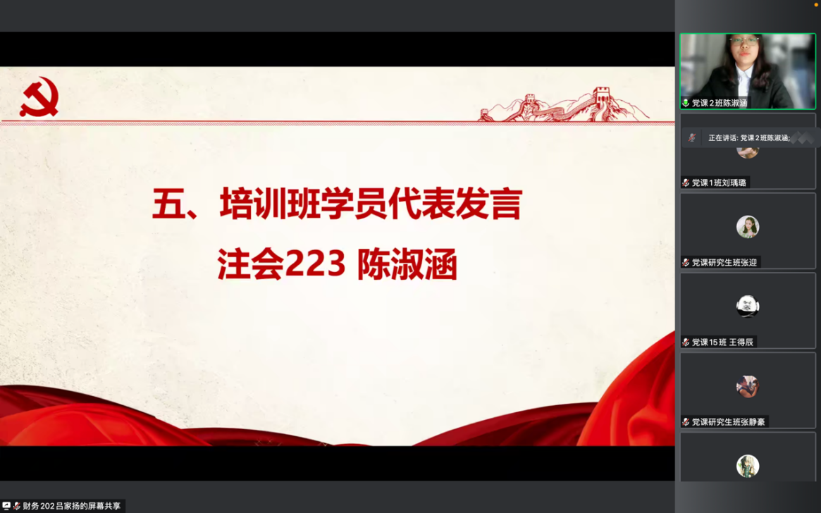 工商20全英李萌、注会223陈淑涵同学分别代表分党校兼职辅导员、学员代表发言,他们表示将积极发挥模范带头作用,认真学习党的理论知识,不断提高自身的思想素质,学思悟践,以优异的成绩完成学习与实践任务。
