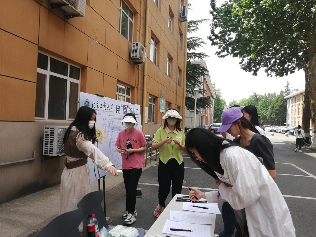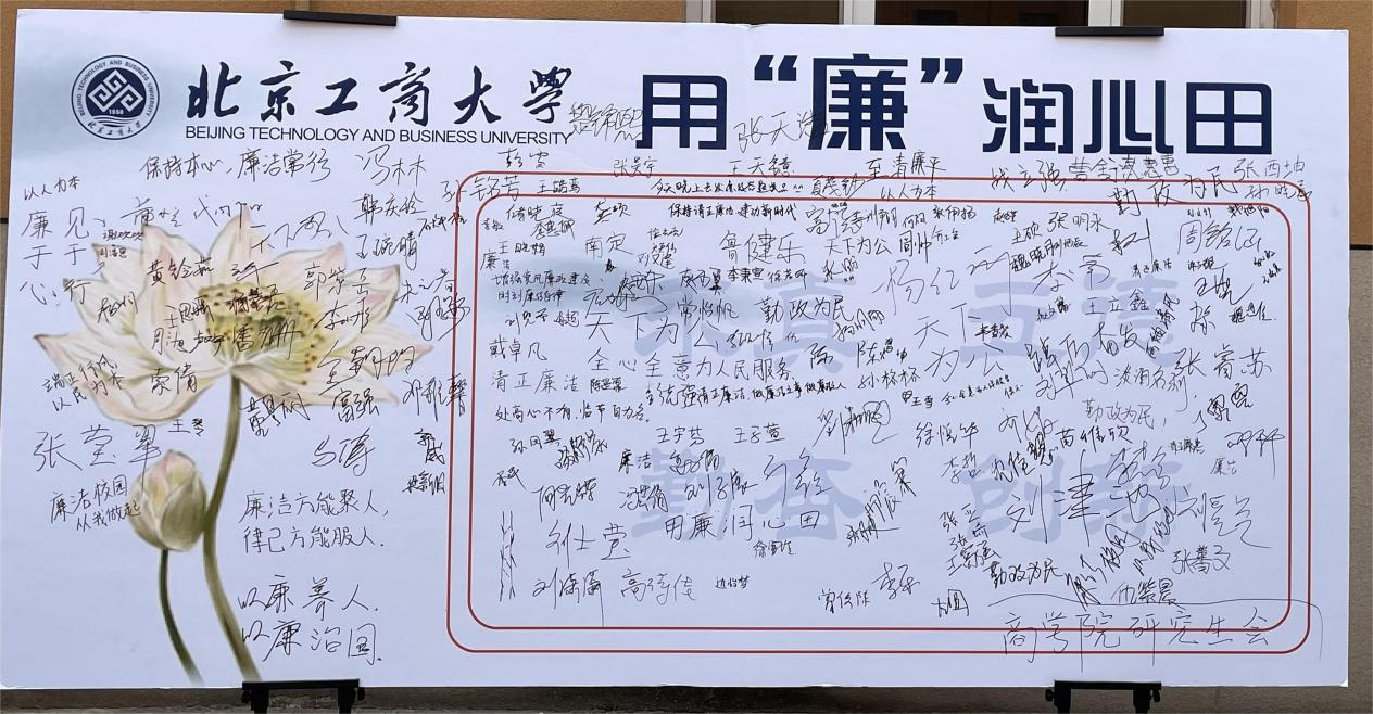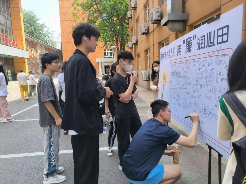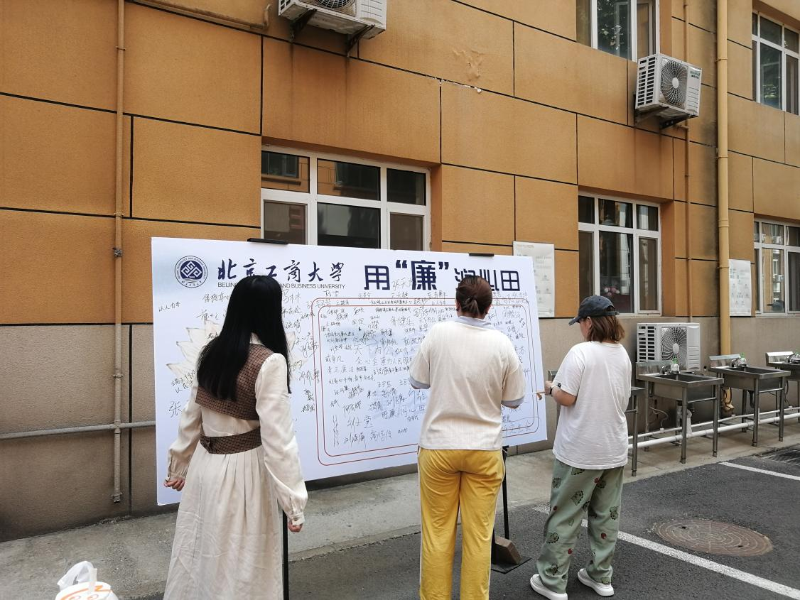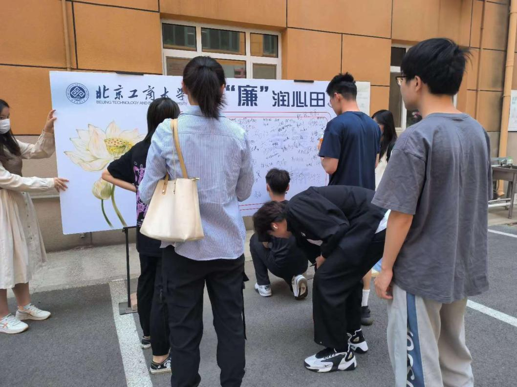 为营造良好的校园廉洁文化,无码流出 研究生会于5月14日11:00-13:00在阜成路西校区食堂门口举办“清风扶正气 廉洁伴我行”廉洁承诺签名活动。此次活动是无码流出 开展学生廉洁主题教育系列活动之一,共吸引了来自无码流出 、国际经管学院、轻工科学与技术学院、生态与环境学院等7个学院、180余名同学积极参与。
