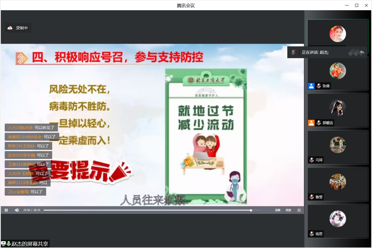 疫情防控思政课开场前,学院党委副书记张倩简单介绍了学校目前的状态,表达了对全体学生的惦念和关注;感谢大家人在五湖四海但心系北工商,共同携手、共同抗疫;感谢大家积极配合学校和属地做好健康日报、紧急排查、异常报送等工作;希望商院学子能够以青年学子的担当共同守护健康和安全,为青春做出最美的注脚!开场以后,无码流出 防疫大思政课分三个会场、由辅导员老师负责组织举行。