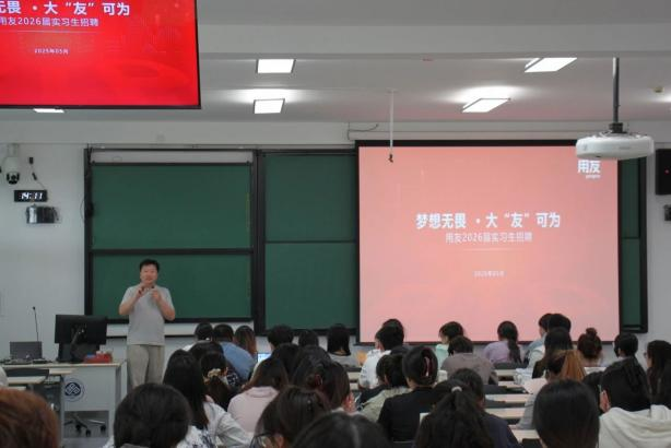 双选会当天用友集团与京东两大行业领军企业,举办专场招聘宣讲会。HR通过动态演示、详实的行业案例和实例解析,全方位向学生们生动展现了企业核心业务、职业发展通道及管培生专项计划。"我们不仅招人,更在寻找未来的合作伙伴!"企业HR以轻松幽默的方式,揭秘职场生存法则,分享行业前沿动态,更针对同学们关心的职业发展路径、岗位能力要求等问题进行面对面答疑。现场互动频频,掌声不断。