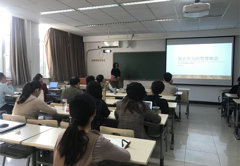 华为高管王凤英专家曾在诺基亚工作了十四年,在华为公司工作了十余年,拥有丰富的管理经验。报告会上,王凤英教授与师生一起分享了在华为公司的工作经历和成长过程,为听众们生动地展示了华为的核心价值体系、华为干部体系、在华为海外研究所的管理经历和体会,并用生动具体的实例对同学们提出的问题逐一解答,现场气氛十分热烈。